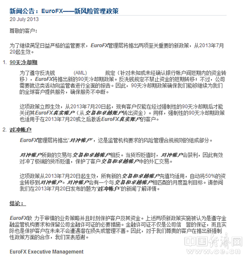 中國經濟網北京11月7日訊(“民生說道”記者 臧允浩)近日,一家名為EuroFX的公司在中國境內多省市以投資外匯名義開展理財業(yè)務。有多名投資者向中國經濟網投訴稱,其用于交易的賬戶自七月份至今,已無法提現。EuroFX公司方面也難以聯(lián)絡到,有投資者懷疑該公司實際是以炒外匯之名,行欺騙之實。 據悉,EuroFX自稱是一家權威的投資理財管理公司,行政辦事處設在倫敦的梅費爾,客戶中心位于倫敦蒼鷺大廈,是新西蘭金融監(jiān)管機構服務協(xié)會(FSP)的合法注冊企業(yè),為黃金、白銀、卓越三類客戶提供外匯交易,客戶投資后擁有活期賬戶與交易賬戶,并將資金從活期賬戶轉至EuroFX交易賬戶在該公司自行研發(fā)的自動化交易系統(tǒng)內進行交易,白銀客戶每月保守交易盈利9%,黃金客戶每月保守交易盈利12%,而卓越賬戶每月保守交易盈利則高達16%。 中國經濟網記者登錄EuroFX官網,發(fā)現該公司并沒有在中國設立辦事處,留下的聯(lián)系方式也是英國倫敦的。記者通過投資者提供的EuroFX公司郵箱向其發(fā)送郵件問詢,但截至發(fā)稿前,仍未收到回復。 動輒百萬投資 竟無半紙合同 EuroFX公司的收款賬戶 2012年10月,經朋友介紹,大連的楊女士了解到一家名為EuroFX的公司正在面向中國人募集資金,這些資金將被用來炒外匯,月收益率高達16%?!芭笥迅嬖V我,之前這項業(yè)務不向亞洲開放,直到金融危機后,才逐步放開”,楊女士告訴記者,“如此之高的收益率,再看到朋友現身說法,的確大為心動”。 于是,楊女士便一下投入了60余萬人民幣。中國經濟網記者了解到,EuroFX賬戶的投資額度分三個等級,最低5萬美金是白銀賬戶,月收益率9%,還有最低投入10萬美元的黃金賬戶,月收益率12%,以及最低投入15萬美元的卓越賬戶,月收益率高達16%。楊女士的賬戶就屬于黃金賬戶。 楊女士告訴記者,投入資金后,EuroFX公司會為投資者建立一個賬戶,登錄其官方網站的個人賬戶后,能看到自己賬戶每日的資金狀況。“前幾個月,的確有其承諾的收益,而且每個周日都可以申請取現,公司會在三日內為你打款”,楊女士稱,因為看到收益如此可觀,且能及時兌現,她把最早的收益也相繼投入到自己的賬戶里。 2013年4月,湖南長沙的張先生也在朋友的勸說下,投入65萬元人民幣,此后又追加到260余萬人民幣。 同樣是今年4月,遼寧鞍山的任先生,也從朋友處聽到這一“好消息”,沒有太多遲疑,他也投入了60余萬元開立了黃金賬戶。 與以上幾地的投資者相比,廣東深圳的王女士算是投資額度較小的了。王女士告訴記者,自己向來謹小慎微,但在朋友反復勸說下,她還是為自己開立一白銀賬戶,投資額達30余萬人民幣, 中國經濟網記者調查發(fā)現,雖然上述投資者投資額度由數十萬到數百萬元人民幣不等,但他們無一人與EuroFX公司簽署過任何書面文件,而這種投資關系的建立,完全憑借親朋好友的介紹。上述楊女士像記者透露,朋友與自己實際是“上下線”關系,介紹一位投資者加入會有相應的提成。 中國經濟網記者登錄EuroFX網站,在其“常見問題解答”一欄中有信息顯示:“Euro Forex的每位客戶都需要獲得另一位活躍客戶的推薦。新客戶需要獲得老客戶的推薦,以保證我們業(yè)務的誠實性。如果沒有合適的推薦人,用戶無法自己注冊為客戶”。 有投資者懷疑,這其實是借鑒了傳銷發(fā)展會員的手法,只不過是借理財的名義,在網絡中大行其道而已。 賬戶突然凍結 至今無法提現 EuroFX公司發(fā)布的公告 2013年7月20日,對于這些習慣了每日登陸EuroFX賬戶,查看收益情況的投資者們而言,的確不是一個好日子。 長沙的張先生仍然記得,就是在這一天,他登入自己的賬戶后發(fā)現,賬戶當天并沒有交易記錄,也沒有產生應有的利潤。 類似的情況,同樣發(fā)生在其他EuroFX投資者身上,不久他們就看到公司的公告。公告顯示,為了遵守反洗錢 (AML) 規(guī)定(針對未知或未經確認銀行帳戶間短期內的資金轉移),EuroFX將推出新的90天冷卻期政策。反洗錢規(guī)定不禁止資金的短期轉移;不過,公司需要就這類活動向監(jiān)管者進行全面的報告。因此,90天冷卻期政策確保我們能夠繼續(xù)為我們的全球客戶提供服務,確保服務不中斷。 這則公告還宣布,EuroFX管理層將推出“對沖帳戶”,稱此為監(jiān)管機構要求的風險管理合規(guī)規(guī)則的組成部分。這項政策從2013年7月20日起生效,客戶往他們的對沖帳戶中充值的金額應與交易和卓越帳戶中的余額總和相等。 然而,這則公告仍然不能讓遠在大洋彼岸的這群投資者放心,長沙的張先生表示:除了這則簡短的公告外,再無更詳細的說明。究竟賬戶是否安全,更無從得知了。而新公布的對沖賬戶,被一些投資者質疑為“公司又一輪斂財的手段”。 大連的楊女士向記者坦陳,長期以來,投資人都無法直接聯(lián)系到公司,大部分信息主要依靠“上線”傳達。三個月的資金凍結期,讓這群消息閉塞的投資者們度日如年。 2013年9月18日,EuroFX發(fā)布公告稱公司將與來自該行業(yè)的幾家公司合并為更大的實體,但并未透露具體與何公司合并。而此次合并將從2013年9月16日開始,持續(xù)30天。該公告還列舉了公司合并后帶來的變化,其中包括:公司將為客戶發(fā)行Visa、Master、Maestro和Cirrus等支付卡;開設新的地區(qū)總部和客戶服務中心;更高的交易利潤率等。但在這期間,不能提供信用取