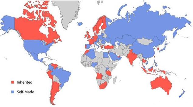 法國(guó)經(jīng)濟(jì)學(xué)家Raul Amoros對(duì)不同國(guó)家首富的資金來源做了個(gè)統(tǒng)計(jì),發(fā)現(xiàn)“拼爹”當(dāng)上的首富跟“拼才華”白手起家的首富比基本是1:1。他把統(tǒng)計(jì)結(jié)果發(fā)到了網(wǎng)站上。這張圖中紅色區(qū)域代表首富財(cái)產(chǎn)來自繼承家族遺產(chǎn),藍(lán)色代表這個(gè)地區(qū)有一位白手起家的首富??偟膩碚f,52%的首富是含著金鑰匙出生,剩下的就得“拼才華”了。