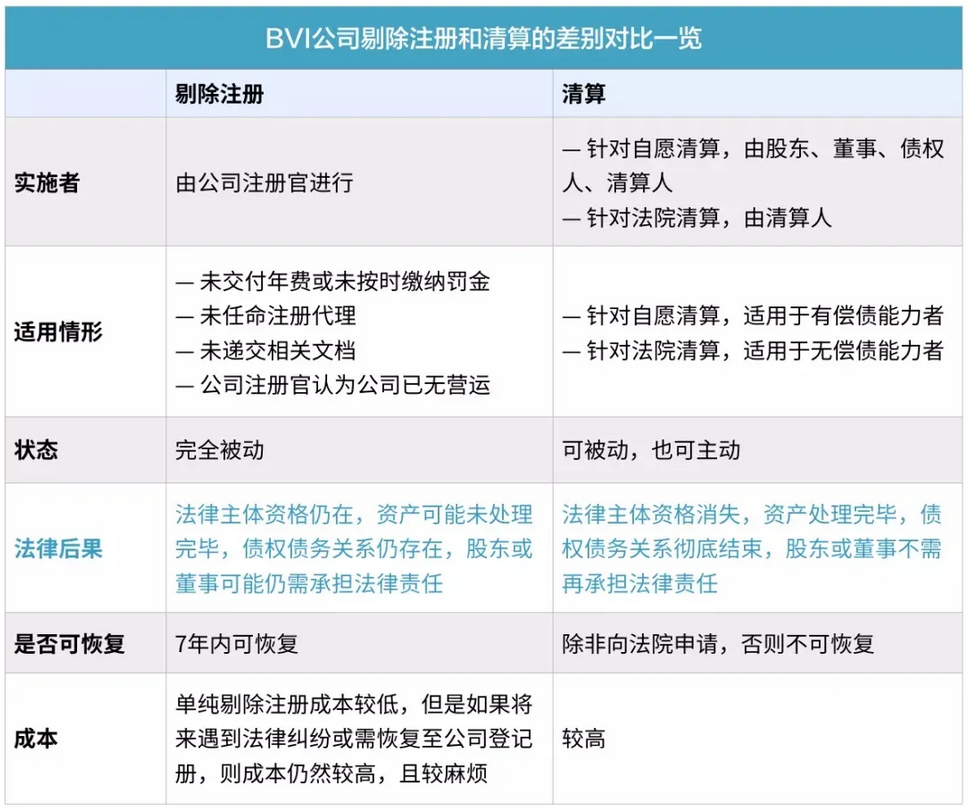 一個重要的原因是,自2019年開始,BVI開始實施《經(jīng)濟實質(zhì)法案》,要求BVI公司滿足經(jīng)濟實質(zhì)并確定稅收居民身份,從而導(dǎo)致合規(guī)成本和稅務(wù)成本激增,傳統(tǒng)優(yōu)勢盡失。 (重要提醒:BVI公司被剔除注冊(Strike off)后,仍需滿足經(jīng)濟實質(zhì)法要求) 此外,新冠疫情病毒肆虐,全球經(jīng)濟遇冷,更是讓BVI公司雪上加霜,因此才會出現(xiàn)日子難過,數(shù)據(jù)“一年不如一年”的境況。 二、BVI公司不好用了,不能任由被Strike off 事實上,不僅BVI公司的新設(shè)遭遇“滑鐵盧”,不少已有的BVI公司也因受到《經(jīng)濟實質(zhì)法案》的較大沖擊,而不得不考慮解散,甚至有些人想“一棄了之”,任由公司注冊官將其剔除注冊(Strike off)。 近來,我們陸續(xù)接到一些客戶該等咨詢。對此,我們的回復(fù)是:您可以選擇讓您的BVI公司被剔除注冊,但是,考慮風(fēng)險較大,我們不建議您這樣做! 這是因為,剔除注冊對公司的解散不徹底:任何BVI公司被公司注冊官剔除公司登記冊,并不影響其公司股東、董事、經(jīng)理和高級職員的責(zé)任,該等責(zé)任如同公司沒有被解散一樣繼續(xù)存在,并可以強制執(zhí)行。 那么,剔除注冊和清算有何區(qū)別?剔除注冊后,BVI公司是否就不用滿足經(jīng)濟實質(zhì)要求了呢?剔除注冊的法律后果和風(fēng)險何在? 接下來,就讓我們來告訴您上面“靈魂三連問”的答案。 三、大不同:剔除注冊和清算的差別 根據(jù)《BVI公司法》第213條,當(dāng)?shù)毓咀怨倏筛鶕?jù)以下方式把BVI公司剔除注冊: (1)不繳年費或未能于限期前繳納當(dāng)?shù)卣牧P款,這是最為直接的方式。 (2)未能根據(jù)BVI公司法的要求,呈交報表及法例所要求的文件。 (3)未能委任注冊代理人/當(dāng)?shù)卮砣?。(除了被剔除注冊,未委任注冊代理人的公司還會被處罰。) (4)當(dāng)?shù)毓咀怨僬J(rèn)為該公司已經(jīng)不經(jīng)營任何業(yè)務(wù)。 值得注意的是,公司仍在運營、甚至仍有資產(chǎn)和負(fù)債也可能被剔除注冊。但公司注冊官一般不會輕易為之,如有必須,其會向BVI金融服務(wù)管理局(Financial Services Commission)尋求進(jìn)一步調(diào)查后,才會做出該等剔除注冊。 四、風(fēng)險很大:被剔除注冊的法律后果 BVI公司被剔除注冊并非“被解散”(Dissolved),其法律主體資格仍然存在。根據(jù)《BVI公司法》第215條及相關(guān)修訂法例,當(dāng)一家BVI公司被注冊官剔除注冊后,其公司董事、股東和清算人或接盤人: