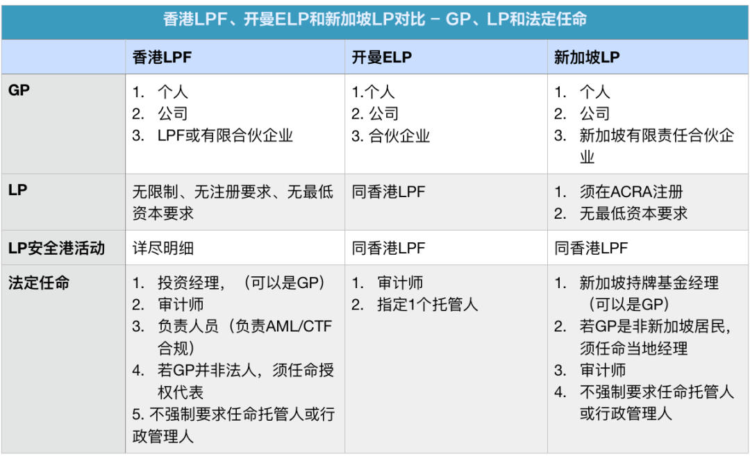 在GP方面,三個(gè)司法管轄區(qū)無(wú)明顯區(qū)別。在LP方面,香港LPF和開(kāi)曼ELP都無(wú)注冊(cè)要求,但對(duì)于新加坡LP而言,則須在ACRA注冊(cè),注冊(cè)要求相對(duì)較多。