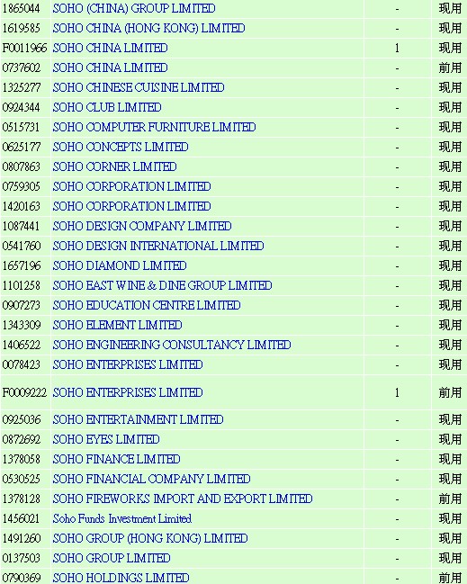 樓主請看圖,這是在香港公司注冊處以 SOHO ** LIMITED 登記注冊的公司,按你這么說,SOHO中國是不是要告他們?
