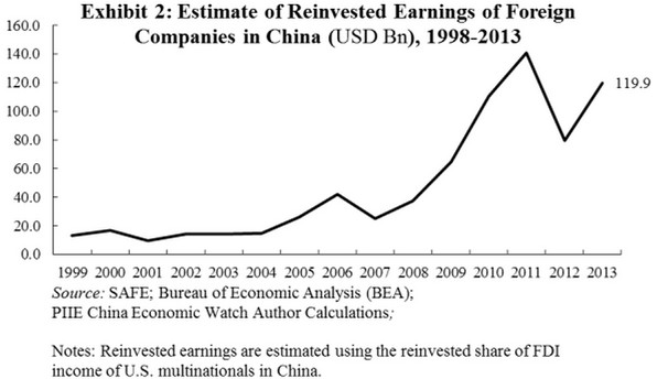 兩種數(shù)據(jù)中所出現(xiàn)的巨大的、并在逐漸增長(zhǎng)的差距,大多是源于再投資收益。商務(wù)部并不登記那些不以資本投資的名義上報(bào)的再投資。在中國(guó),外國(guó)公司和外國(guó)投資的收益在2013年可能會(huì)達(dá)到接近2180億美元?;谠谥袊?guó)的美國(guó)跨國(guó)公司的數(shù)據(jù)來(lái)看,至少一半的收入將被再投資。作為對(duì)比,2013年外國(guó)公司上報(bào)的資本投資總共卻只有420億美元。從這可以看出,保守估計(jì)的話(huà),再投資收益至少占SAFE和MOFCOM外商直接數(shù)據(jù)差額的60%。