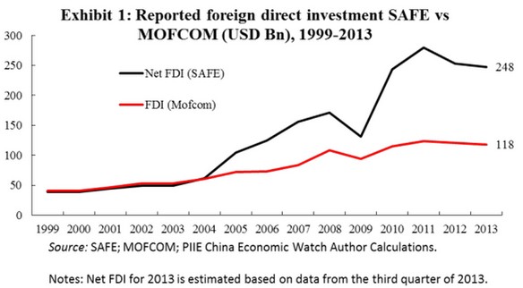 中國(guó)在外商直接投資上發(fā)布了兩組數(shù)據(jù)。第一組是由商務(wù)部(MOFCOM)發(fā)布。商務(wù)部的數(shù)據(jù)顯示,2013年中國(guó)僅有1180億美元流入。第二組是由國(guó)家外匯管理局(SAFE)發(fā)布的。外管局的數(shù)據(jù)是前一組數(shù)據(jù)的兩倍。