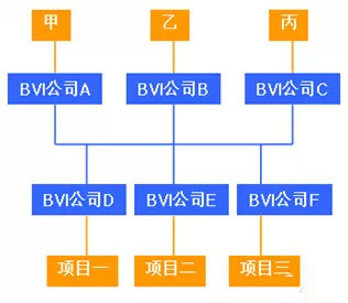 甲、乙、丙三人的海外投資結(jié)構(gòu)需要合理優(yōu)化,借助離岸平臺(tái)的優(yōu)化結(jié)果見下圖。首先,由甲、乙、丙三人各自持有一間BVI公司,分別為A、B、C,從而確保投資者信息的不透明性,三人的信息將完全被保密,保證原始投資信息的安全,并且將原本屬于甲、乙、丙三人的共同投資行為從投資人信息上進(jìn)行分離和隱藏,獲得投資者非關(guān)聯(lián)化的效果。其次,A、B、C三間BVI公司共同持有一間BVI公司D,D公司投資海外項(xiàng)目一;A、B、C三間BVI公司共同持有一間BVI公司E,E公司投資海外項(xiàng)目二;A、B、C三間BVI公司共同持有一間BVI公司F,F(xiàn)公司投資海外項(xiàng)目三。由于D、E、F都是BVI公司,依然利用其不透明性保證了投資方的信息安全。最后,用D、E、F三間BVI公司分別持有三個(gè)海外項(xiàng)目,達(dá)到了風(fēng)險(xiǎn)分散的目的。