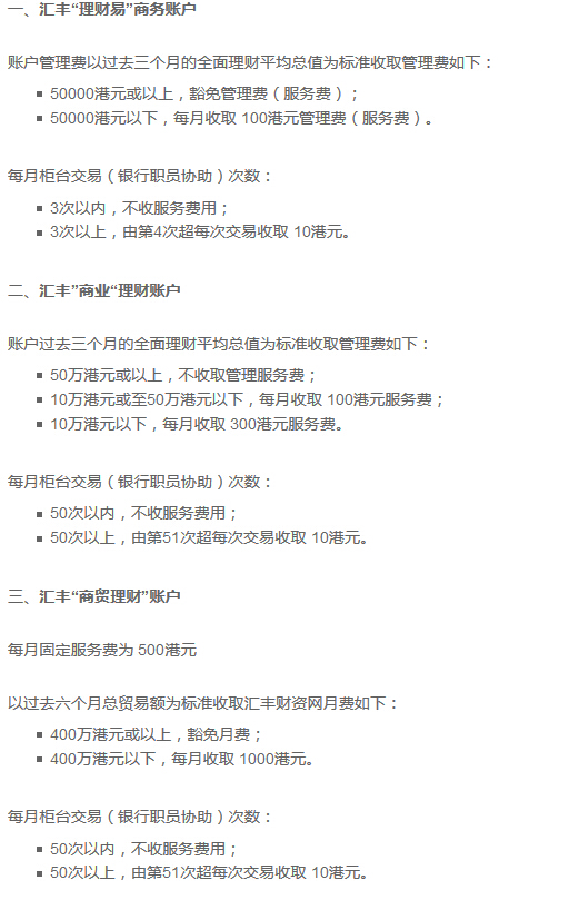 香港匯豐銀行商務(wù)理財 服務(wù)月費200元答