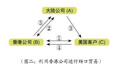 以香港公司為例(參見(jiàn)圖一、二),介紹如何通過(guò)離岸公司轉(zhuǎn)口貿(mào)易操作達(dá)到避稅的目的。