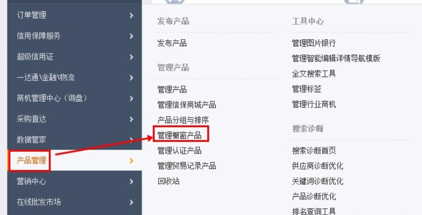 入口一:My Alibaba后臺(tái)-產(chǎn)品管理-管理櫥窗產(chǎn)品。