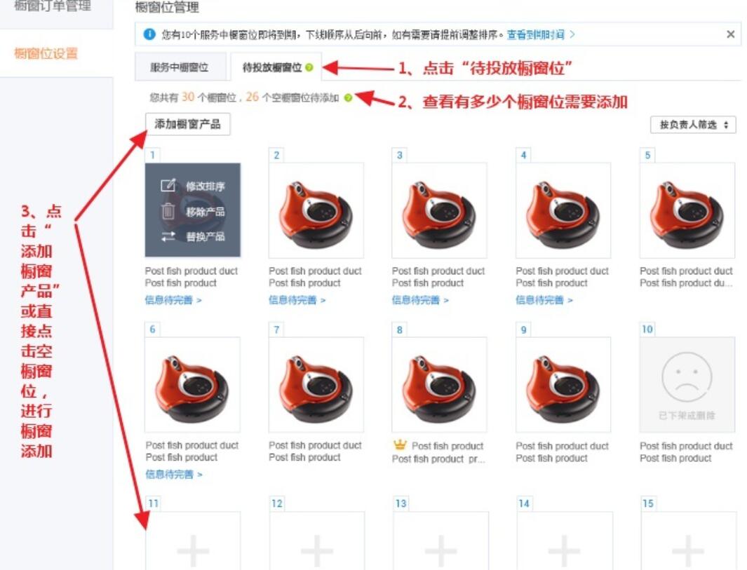 進(jìn)入“櫥窗位設(shè)置”頁面,點(diǎn)擊“待投放櫥窗位”,查看有多少個(gè)櫥窗位需要添加,按提示數(shù)量準(zhǔn)確添加;點(diǎn)擊添加櫥窗產(chǎn)品,或直接點(diǎn)擊空櫥窗位進(jìn)行櫥窗產(chǎn)品添加,上線順序從前往后。