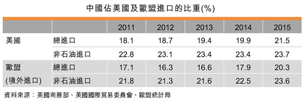 表:中國占美國及歐盟進(jìn)口的比重(%)