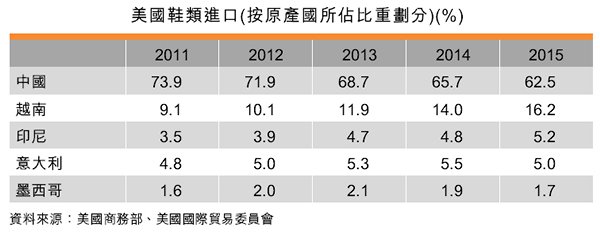 鞋類方面,中國仍占美國進(jìn)口的大部分,不過所占比重已從2011年的73.9%下降到62.5%。歐盟境外進(jìn)口鞋類方面,中國所占的比重從2011年的50.5%下降到2015年的46.3%。此外,越南及印尼均是美國及歐盟主要的進(jìn)口鞋類供應(yīng)國。
