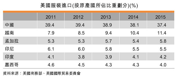 表:美國服裝進(jìn)口(按原產(chǎn)國所占比重劃分)(%)