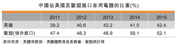 表:中國占美國及歐盟進(jìn)口家用電器的比重(%)