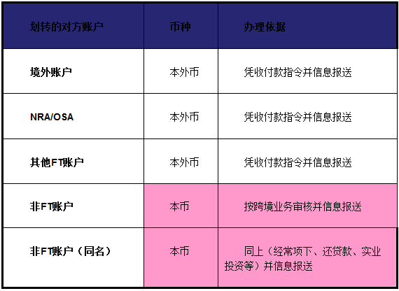 FT賬戶和境內(nèi)非FT賬戶(含同名賬戶)之間劃轉(zhuǎn)是根據(jù)有限滲透加嚴(yán)格管理的原則按跨境業(yè)務(wù)實(shí)施管理。