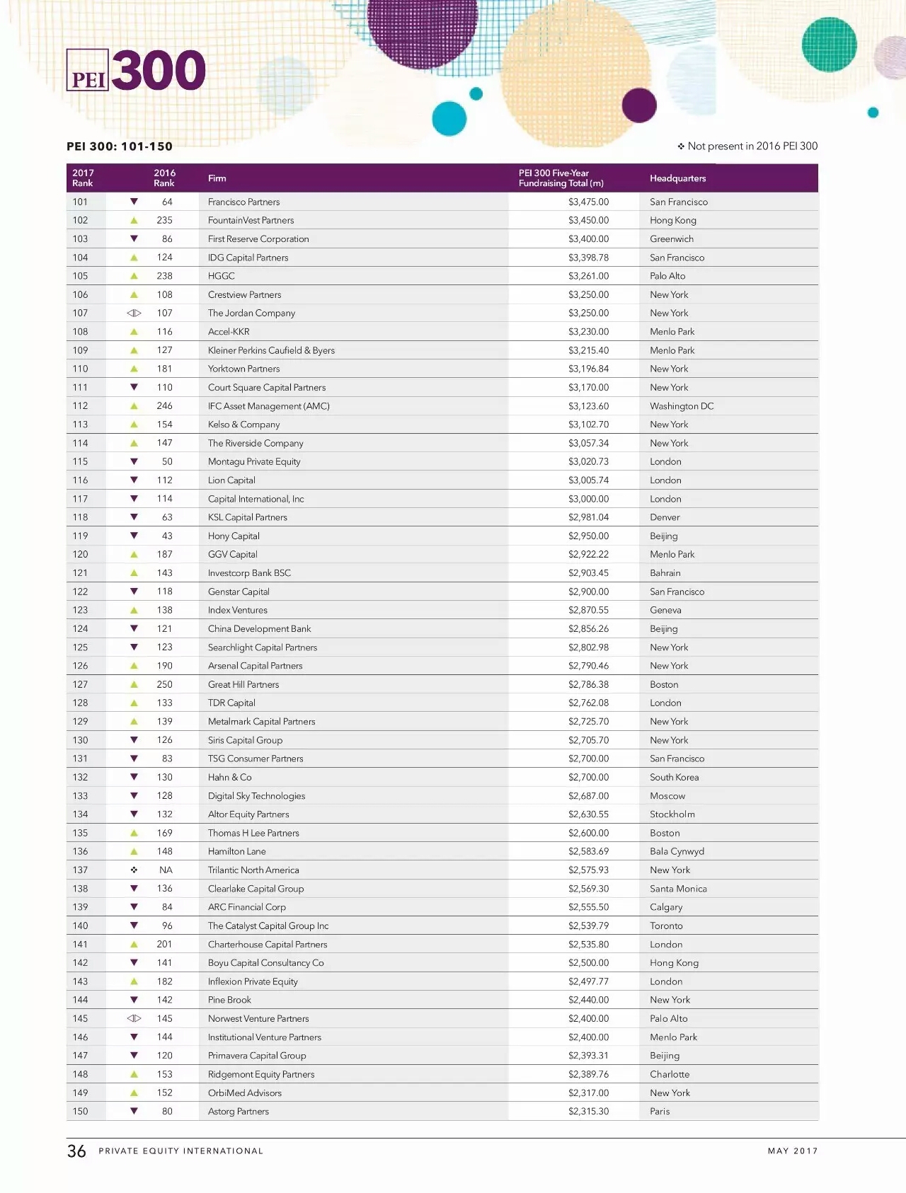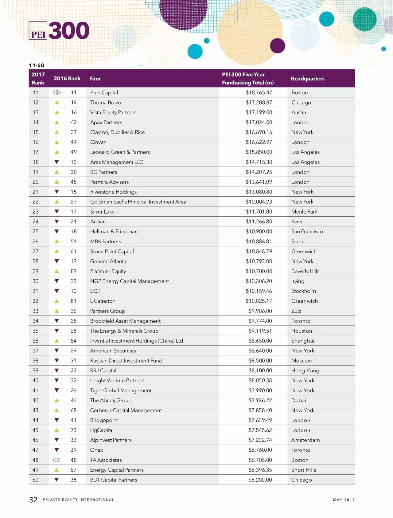 5月7日,倫敦最具權(quán)威的全球另類資產(chǎn)投資(私募股權(quán),債權(quán)投資,房地產(chǎn),etc.) 排名媒體Private Equity International發(fā)布了2016年最新的全球私募股權(quán)機(jī)構(gòu)排名。按照過去五年的融資額進(jìn)行排名,在各個(gè)機(jī)構(gòu)IRR并不透明的今天,融資額作為一個(gè)代表專業(yè)市場(chǎng)認(rèn)可度的指標(biāo),以五年為限,具有相當(dāng)?shù)墓哦取?這里主要提及在中國有業(yè)務(wù)的外資PE以及部分國內(nèi)本土的主流玩家,先看前十七名(將在大陸比較活躍的Silverlake包括進(jìn)來)。