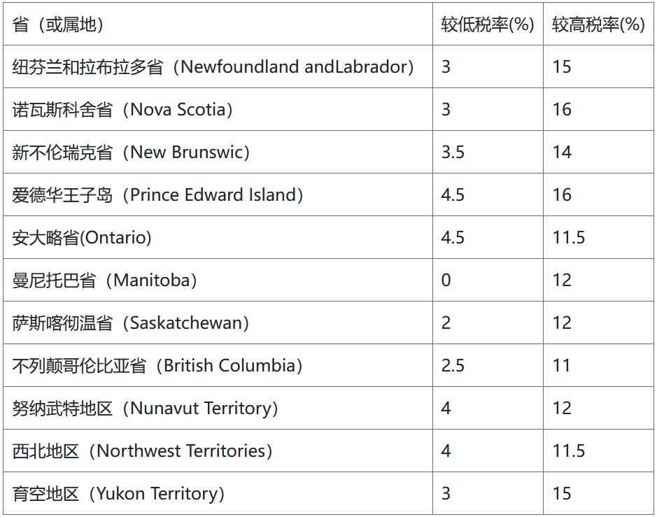 通常情況下,?。ɑ?qū)俚兀┧枚愒O(shè)有兩檔稅率,即較低稅率和較高稅率。根據(jù)報(bào)稅收入的等級梯度采取不同稅率。較低稅率的使用限定是50萬加幣。
