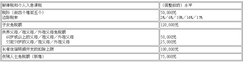 新條例落實(shí)二零一八至一九年度政府財(cái)政預(yù)算案所建議的稅收寬減措施。有關(guān)措施包括一次性寬減二零一七/一八課稅年度百分之七十五的薪俸稅、個(gè)人入息課稅及利得稅,每宗個(gè)案以30,000元為上限。新條例亦落實(shí)由二零一八/一九課稅年度起,與薪俸稅和個(gè)人入息課稅有關(guān)的稅收寬減措施,詳情如下: