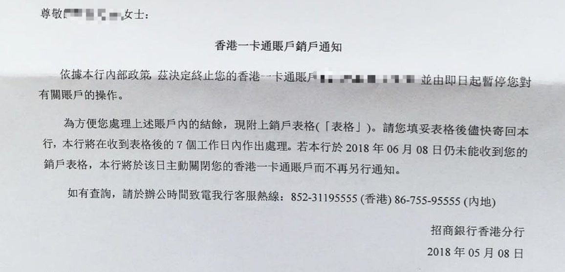 為方便您處理上述賬戶內(nèi)的結(jié)余,現(xiàn)附上銷(xiāo)戶表格。請(qǐng)您填妥表格后盡快寄回本行,本行將在收到表格后的七個(gè)工作日內(nèi)作出處理。若本行于2018年06月08日仍未能收到您的銷(xiāo)戶表格,本行將于該日主動(dòng)關(guān)閉您的香港一卡通賬戶而不再另行通知。