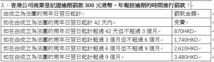 1)香港公司注冊(cè)署——完成周年申報(bào)文件A 時(shí)間:按每一個(gè)周年辦理。B 費(fèi)用:政府收105。C 作用:以做最新的備案,是公司在這一年內(nèi)有沒(méi)有資金、股東、及董事變更、或其他情況等。D 逾期罰款:注冊(cè)處周年申報(bào)逾期費(fèi)用詳細(xì)(按遞交日期不同收取不同費(fèi)用):如在由成立為公司的周年日翌日起計(jì)超過(guò)42天但不超過(guò)3個(gè)月 HKD 870如在由成立為公司的周年日翌日起計(jì)超過(guò)3個(gè)月但不超過(guò)6個(gè)月 HKD 1,740如在由成立為公司的周年日翌日起計(jì)超過(guò)6個(gè)月但不超過(guò)9個(gè)月 HKD 2,610如在由成立為公司的周年日翌日起計(jì)超過(guò)9個(gè)月以上 HKD 3,480最高罰5萬(wàn)及每日罰700 ,所有責(zé)任由董事承擔(dān)。要是您的不打算運(yùn)營(yíng)的話,您最好是選擇停業(yè)或者是注銷(xiāo)公司,否則的話,要是一直公司不做年檢,欠了政府部門(mén)的款項(xiàng),香港的出入境署是有登記的,這樣對(duì)您以后進(jìn)出香港會(huì)有一定的影響。 (2)香港稅務(wù)局——更換商業(yè)登記證A 時(shí)間:證書(shū)上到期的時(shí)間。(可以提前1個(gè)月領(lǐng)?。〣 費(fèi)用:政府收費(fèi)RMB450到2,600之間,此費(fèi)用為政府費(fèi)用,隨政府的調(diào)整而浮動(dòng)。香港政府會(huì)根據(jù)每年的政府財(cái)政運(yùn)營(yíng)支出情況對(duì)香港公司年審的商業(yè)登記證費(fèi)用做一個(gè)調(diào)整,如果政府運(yùn)營(yíng)狀況好的話,那么價(jià)格會(huì)相對(duì)較優(yōu)惠。C 作用:主要是延續(xù)香港公司的合法經(jīng)營(yíng)權(quán)利,同時(shí)銀行也需要這份文件來(lái)證實(shí)公司可以繼續(xù)使用帳戶(hù)。D 逾期罰款:商業(yè)登記證失效超過(guò)30天,即會(huì)產(chǎn)生稅務(wù)局登記逾期罰款HKD 300 因上述逾期還可能會(huì)收到法院傳票,被要求上法院應(yīng)訴及支付相應(yīng)的上庭費(fèi)用。 3. 香港稅務(wù)局一般在公司注冊(cè)成立日后18個(gè)月左右發(fā)出第一份報(bào)稅表;之后需每年按評(píng)稅基期報(bào)稅。