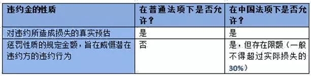 中國(guó)法不禁止在合同中規(guī)定“罰金”,但會(huì)限制其范圍。在中國(guó)合同法下,違約金不得“過(guò)分高于”實(shí)際損失[5]。在實(shí)務(wù)中,若某一金額超過(guò)受害方所遭受的實(shí)際損失的30%[6],則其可能被視為“過(guò)高”,中國(guó)法院可根據(jù)實(shí)際損失對(duì)約定的違約金予以適當(dāng)減少。這兩種措施之間的差異大致總結(jié)如下: