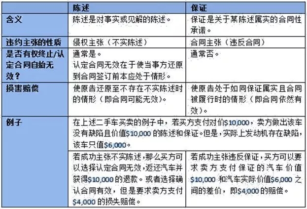 需要注意的一點(diǎn)是,在普通法中,“陳述”與“保證”不同。兩者的區(qū)別在適用普通法的并購(gòu)合同中尤為重要,因?yàn)閷?duì)兩者的使用會(huì)影響到一方違約時(shí)守約方所能獲得的救濟(jì)。以下對(duì)比表格簡(jiǎn)要概述了兩個(gè)概念之間的重要區(qū)別: