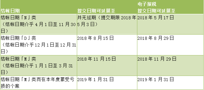 為推廣電子報(bào)稅,若小型法團(tuán)和小型合伙業(yè)務(wù)將透過(guò)互聯(lián)網(wǎng)填報(bào)利得稅報(bào)稅表,稅務(wù)局會(huì)批準(zhǔn)較正常期限多兩星期的延期申請(qǐng)。整批延期提交2017/18年度報(bào)稅表的安排。若你的稅務(wù)代表在整批延期計(jì)劃下,辦妥申請(qǐng)延期提交你的2017/18年度利得稅報(bào)稅表,提交期限通常延展至下述日期: