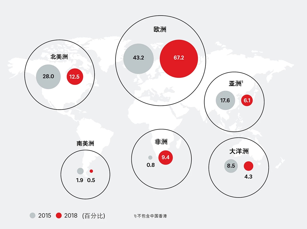 2015年與2018上半年中國海外并購標(biāo)的所屬地區(qū)對比1)——按交易金額
