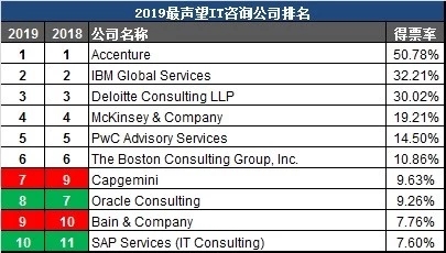 IT咨詢行業(yè)傳統(tǒng)一直是兩強(qiáng)爭(zhēng)霸,埃森哲與IBM是其中的王者,但是最近IBM重新開(kāi)始新一輪業(yè)務(wù)轉(zhuǎn)型,企業(yè)重心更為聚焦下一代信息技術(shù)、云與人工智能。目前在得票率上已經(jīng)被埃森哲拉開(kāi)差距,而其后德勤正在緊緊追趕,不知道明年的榜單會(huì)上演榜眼與探花易位的一幕么?