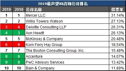 HR咨詢的得票率差距幾乎是所有細(xì)分領(lǐng)域內(nèi)最小的,雖然美世蟬聯(lián)冠軍,但是我們可以看到德勤,麥肯錫,PWC也在蠶食傳統(tǒng)人力咨詢四強(qiáng)的業(yè)務(wù)。而Hay Group在并購(gòu)之后,逐步扭轉(zhuǎn)下跌勢(shì)頭,在今年的榜單中直升3位。