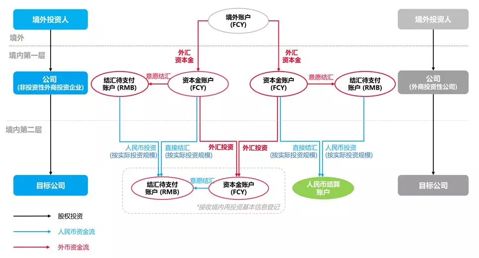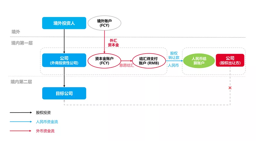 在利用結匯人民幣資金以股權并購的方式進行境內再投資的情形下,就外商投資性公司而言,資本金應當匯入股權出讓方的人民幣結算賬戶且資金使用不受限制,賣方無須進行接收境內再投資基本信息登記;而就非投資性外商投資企業(yè)而言,資本金應當匯入股權出讓方的結匯待支付賬戶,由股權出讓方按照結匯待支付賬戶的支出范圍進行使用,賣方還應辦理接收境內再投資基本信息登記。