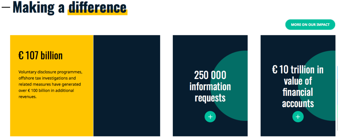 — 這一切指向的都是稅務(wù)透明,說(shuō)白了也就是“征稅”。正如OECD所顯示的那樣,通過(guò)海量數(shù)據(jù)的賬戶信息交換,自動(dòng)信息交換機(jī)制已經(jīng)為各國(guó)稅務(wù)部門創(chuàng)造出了上億歐元的稅收收入。通過(guò)離岸賬戶隱匿信息來(lái)避稅的傳統(tǒng)做法,再也無(wú)法行通了。