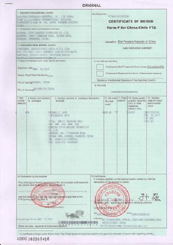 《中國-智利自由貿(mào)易區(qū)優(yōu)惠原產(chǎn)地證明書》,簡稱FORM F,全稱為:CERTIFICATE OF ORIGIN FORM F FOR CHINA-CHILE FTA. 智利的進(jìn)口商從我國進(jìn)口時(shí),憑借此證可享受不同程度的關(guān)稅優(yōu)惠待遇,F(xiàn)ORM F證書是進(jìn)出口出具答