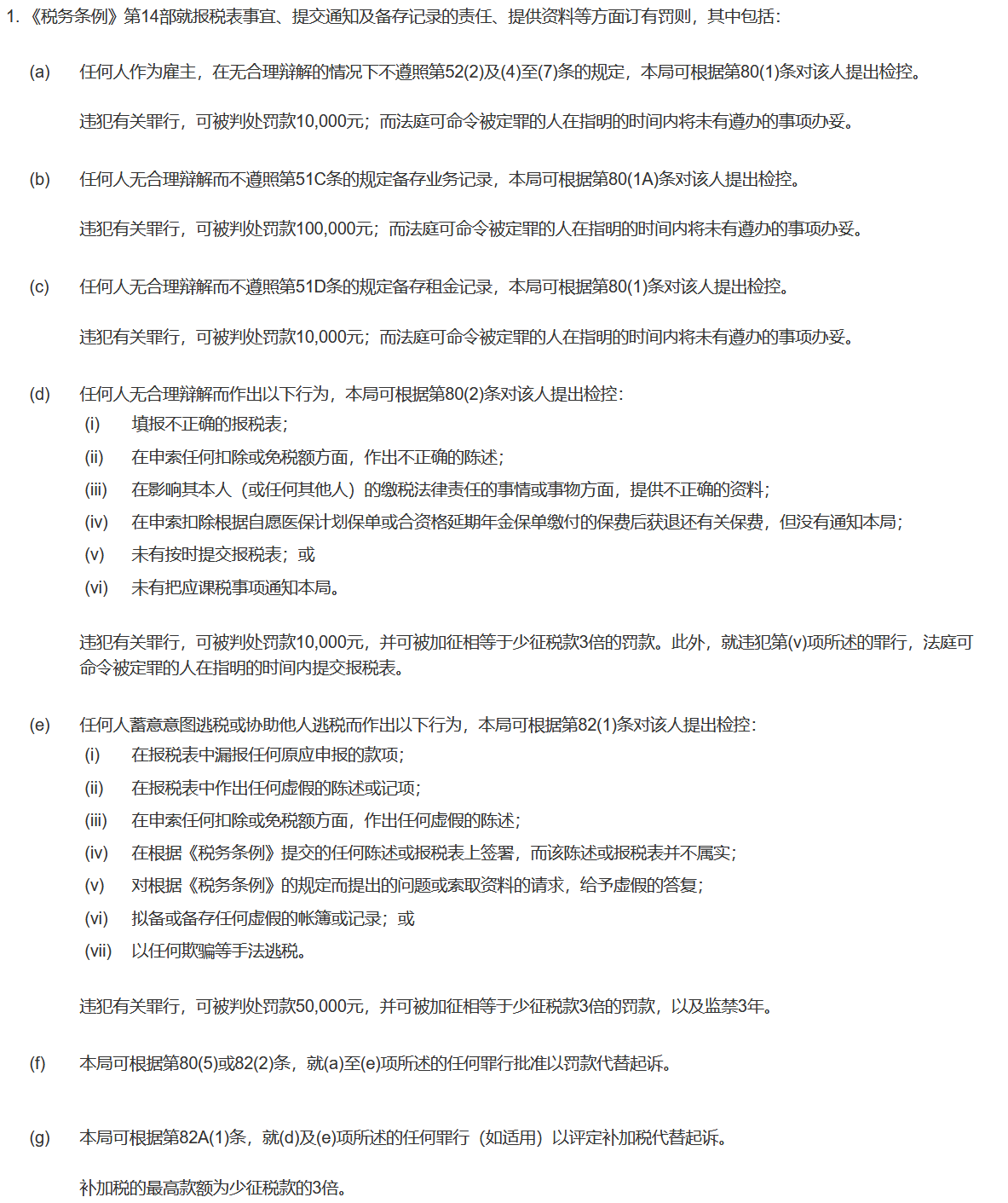 3.以上的百分比僅作為一般指引,并可視乎每宗個(gè)案的情況而上調(diào)或下調(diào)。一般需要考慮的因素包括延遲呈交稅表時(shí)間的長(zhǎng)短、所涉及的稅款、違犯有關(guān)事項(xiàng)的原因、納稅人的態(tài)度以及納稅人所采取的補(bǔ)救措施。