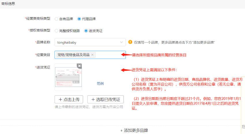 (2)選擇“代理品牌”,代理品牌類(lèi)型選擇“進(jìn)貨憑證”。并提供該品牌商品的進(jìn)貨憑證,進(jìn)貨憑證上需有進(jìn)貨時(shí)間、商品品牌名、進(jìn)貨數(shù)量、供貨方信息和進(jìn)貨方信息,且進(jìn)貨方要為開(kāi)店公司,進(jìn)貨時(shí)間距今不超過(guò)21個(gè)月。進(jìn)貨憑證上請(qǐng)加蓋供貨公司公章或請(qǐng)供貨公司負(fù)責(zé)人簽字。(進(jìn)貨憑證模板請(qǐng)參照本手冊(cè)附錄模板。)