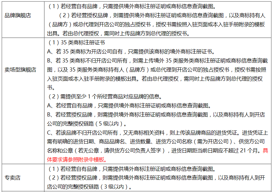 (1)需上傳境外35類(lèi)服務(wù)類(lèi)商標(biāo)注冊(cè)證明或商標(biāo)信息查詢截圖,以及35類(lèi)服務(wù)類(lèi)商標(biāo)持有人(品牌方)或總代理到開(kāi)店公司的獨(dú)占授權(quán)書(shū),授權(quán)書(shū)需按照入駐頁(yè)面或本入駐手冊(cè)附錄的模板出具。若由總代理授權(quán),需同時(shí)上傳品牌方到總代理的授權(quán)書(shū)。