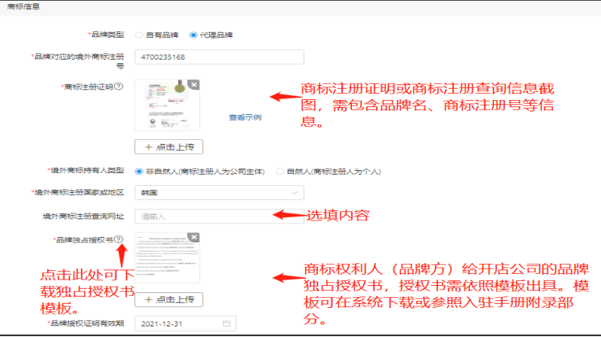 若商標(biāo)為開(kāi)店公司自有,品牌類(lèi)型請(qǐng)選擇“自有品牌”,并填寫(xiě)商標(biāo)注冊(cè)號(hào)和上傳境外商標(biāo)注冊(cè)證明或商標(biāo)信