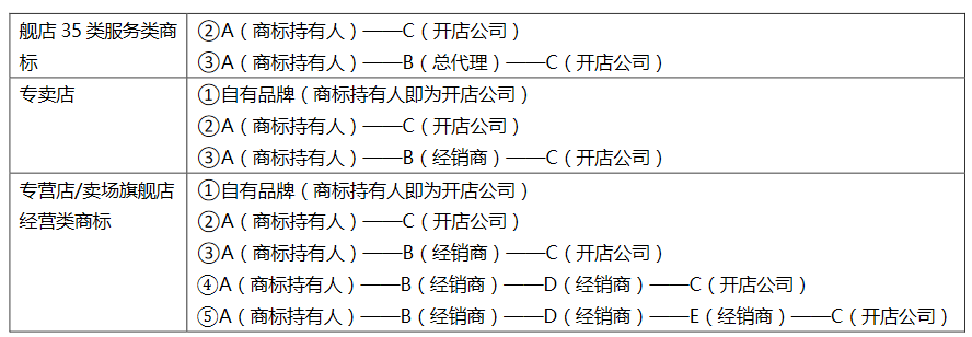(3)完整授權(quán)鏈路是指,以三級(jí)授權(quán)為例,ABC公司中,A為商標(biāo)持有人(一級(jí)),B為經(jīng)銷(xiāo)商(二級(jí)),C為開(kāi)店公司(三級(jí))。則A-B-C即為完整授權(quán)鏈路。開(kāi)店公司C需提供A—B的授權(quán)書(shū)和B—C的授權(quán)書(shū)才可成功開(kāi)設(shè)店鋪。