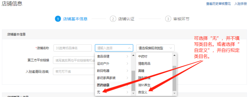②旗艦店和專(zhuān)營(yíng)店類(lèi)目設(shè)置為選填,當(dāng)選擇“無(wú)”時(shí),店名中可不加入類(lèi)目詞。且支持商家選擇“自定義”并自主擬定類(lèi)目名。