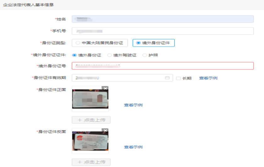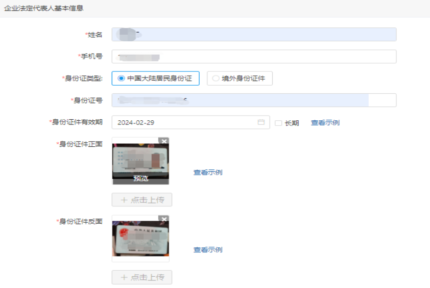 此處需上傳企業(yè)法定代表人的中國(guó)大陸居民身份證圖片、填寫(xiě)企業(yè)法定代表人的手機(jī)號(hào),并按照身份證圖片準(zhǔn)確填寫(xiě)姓名、身份證號(hào)、身份證件有效期。