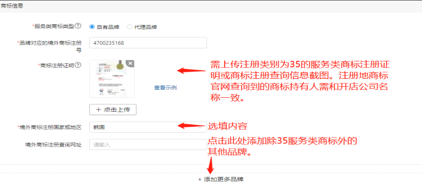 若35類(lèi)服務(wù)類(lèi)商標(biāo)為開(kāi)店公司自有,服務(wù)類(lèi)商標(biāo)類(lèi)型請(qǐng)選擇自有品牌,并填寫(xiě)商標(biāo)注冊(cè)號(hào)和上傳境外商標(biāo)注冊(cè)證明或商標(biāo)信息查詢截圖。