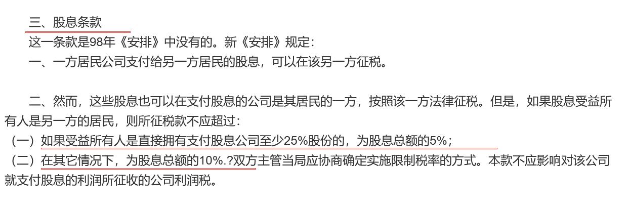 香港公司獲得內(nèi)地投資企業(yè)股息分紅可能適用《內(nèi)地和香港特別行政區(qū)關(guān)于對(duì)所得避免雙重征稅和防止偷漏稅的安排》有關(guān)股息的條款,1.一方居民公司支付給另一方居民的股息,可以在另一方征稅。2.然而,這些股息也可以在支付股息的公司是其居民的一方,按照該一方法律征稅。但是,如果股息受益所有人是另一方的居民,則所征稅款不應(yīng)超過如下要求,即如果受益所有人是直接擁有支付股息公司至少25%股份的,為股息總額的5%。在其他情況下(股份低于25%),為股息總額的10%。雙方主管當(dāng)局應(yīng)協(xié)商確定實(shí)施限制稅率的方式。本款不應(yīng)影響對(duì)該公司就支付股息的利潤所征收的公司利潤稅。