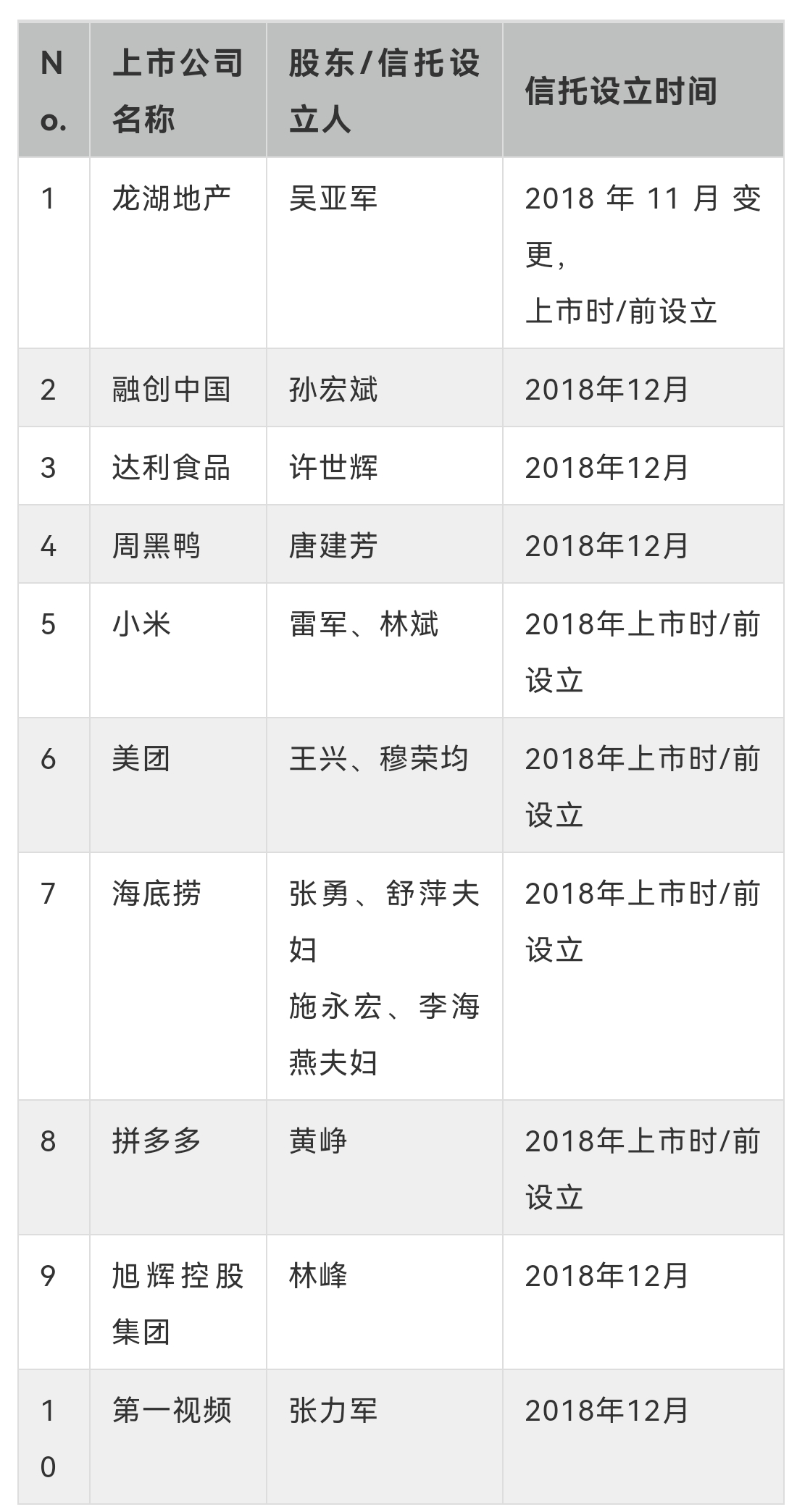 據(jù)坊間傳聞,僅僅在2018年最后兩個(gè)月,中國(guó)內(nèi)地高凈值人士成立/變更了300多個(gè)海外家族信托。比如,著名的小米、美團(tuán)、龍湖地產(chǎn)、海底撈、融創(chuàng)中國(guó)、周黑鴨等(見(jiàn)下表)??梢钥闯?,現(xiàn)階段很多中國(guó)內(nèi)地高凈值人士在將境外資產(chǎn)從“個(gè)人-離岸公司”轉(zhuǎn)移到“離岸信托-離岸公司”架構(gòu)中。