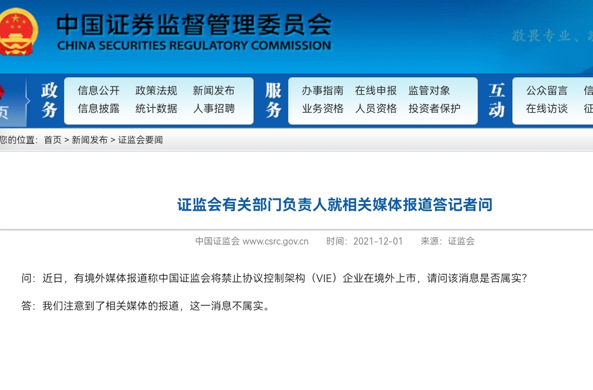 近日有境外媒體報道稱,中國證監(jiān)會將禁止協(xié)議控制架構(VIE)企業(yè)在境外上市。就此,中國證監(jiān)會相關部門負責人表示,證監(jiān)會已經注意到了相關媒體的報道,這一消息不屬實。