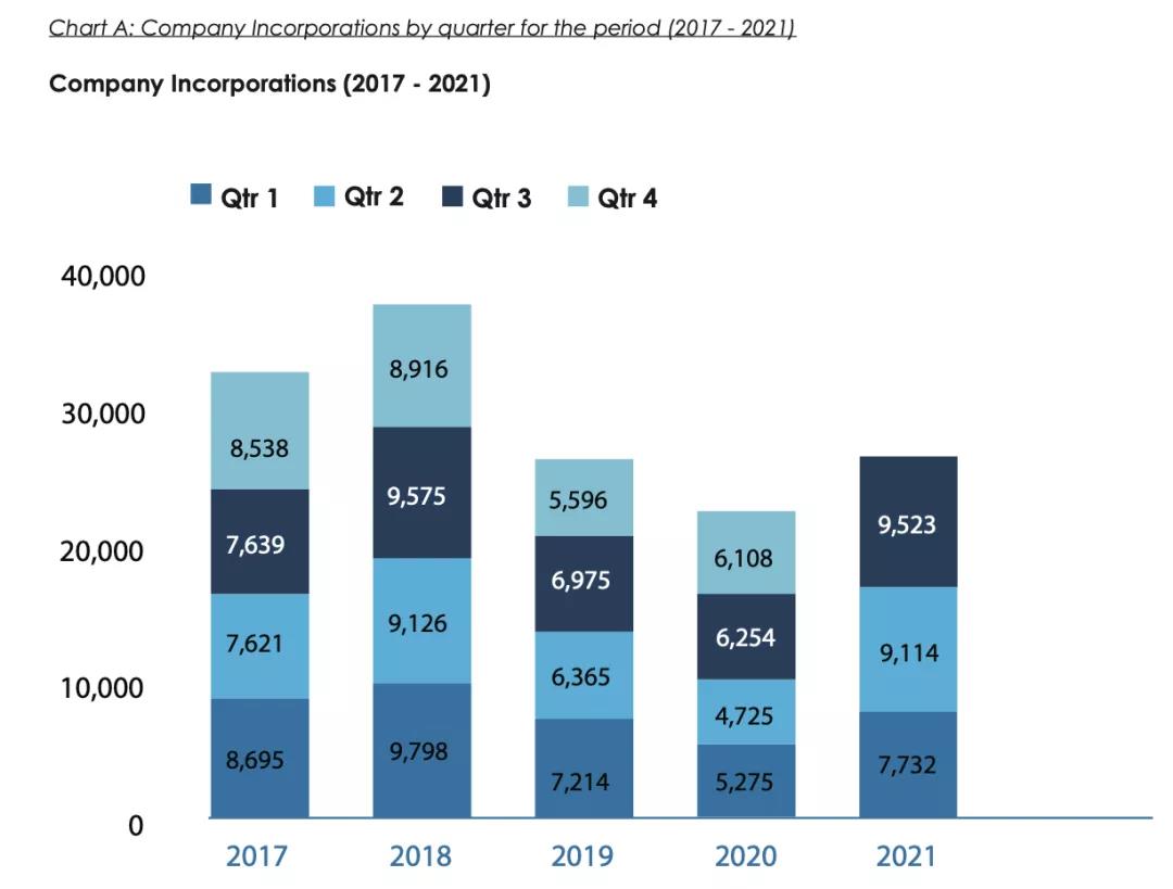 如果我們將BVI公司的注冊(cè)數(shù)據(jù)放到一個(gè)更長(zhǎng)的時(shí)間維度來看的話,會(huì)有一些更加具有價(jià)值的發(fā)現(xiàn)。從過去五年的數(shù)據(jù)上看,今年第三季度的9523家BCs已經(jīng)幾乎和2018年第三季度最高值的9575家持平,恢復(fù)勢(shì)頭喜人。