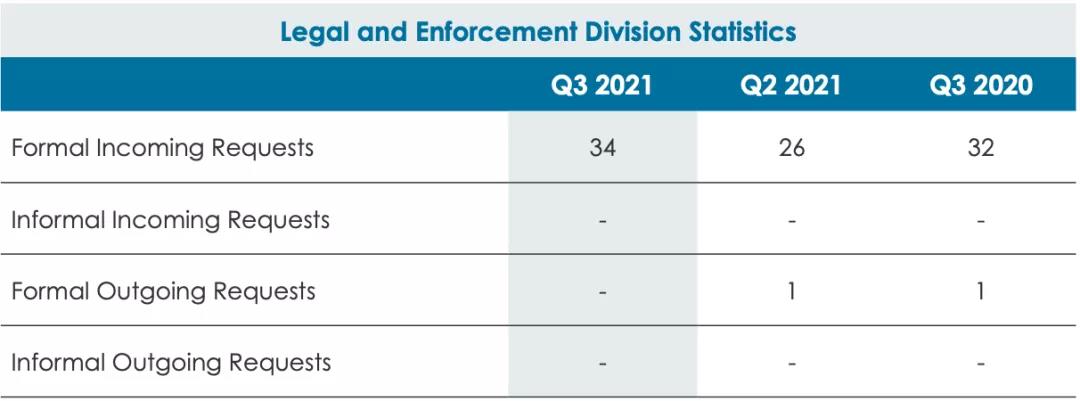 在2021年第三季度,BVI總計(jì)實(shí)施了34起的信息交換申請(qǐng),無論是與2020年第三季度(32起)同比,還是與2021年第二季度(26起)環(huán)比,都略有增加。
