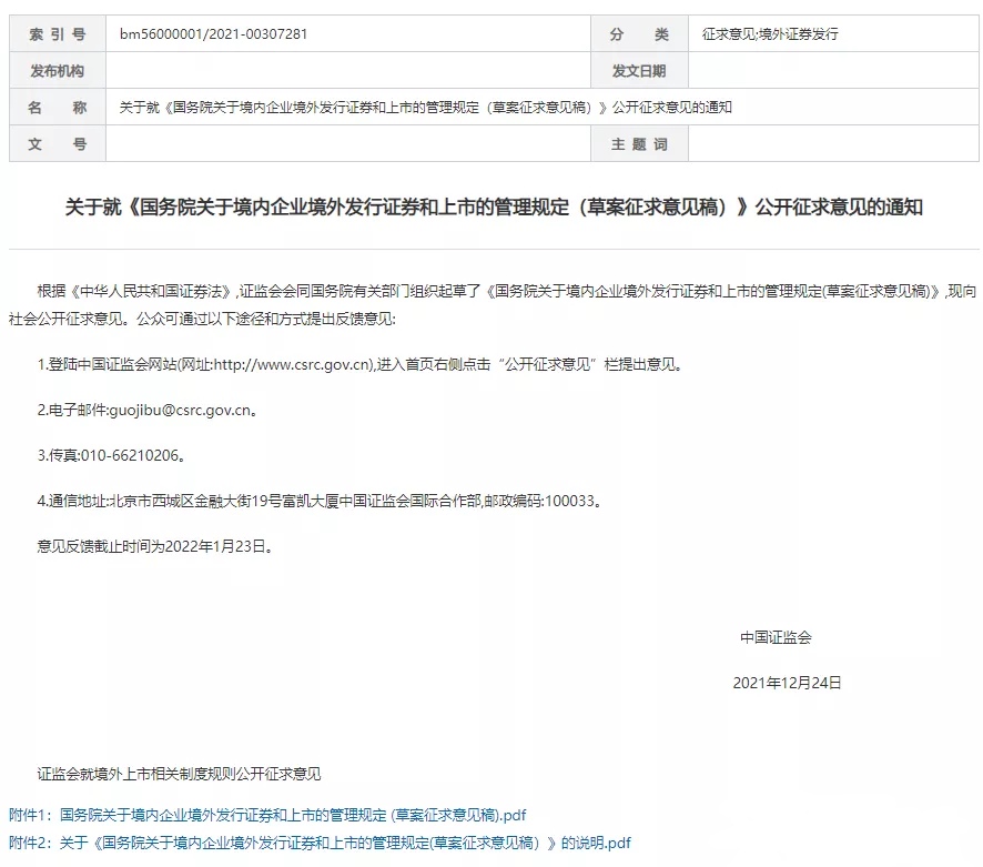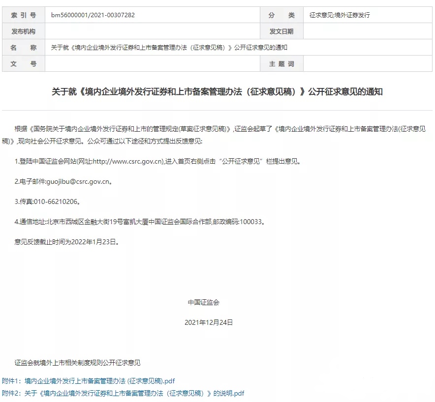 境內(nèi)企業(yè)境外發(fā)行證券和上市備案管理辦法(征求意見稿)
