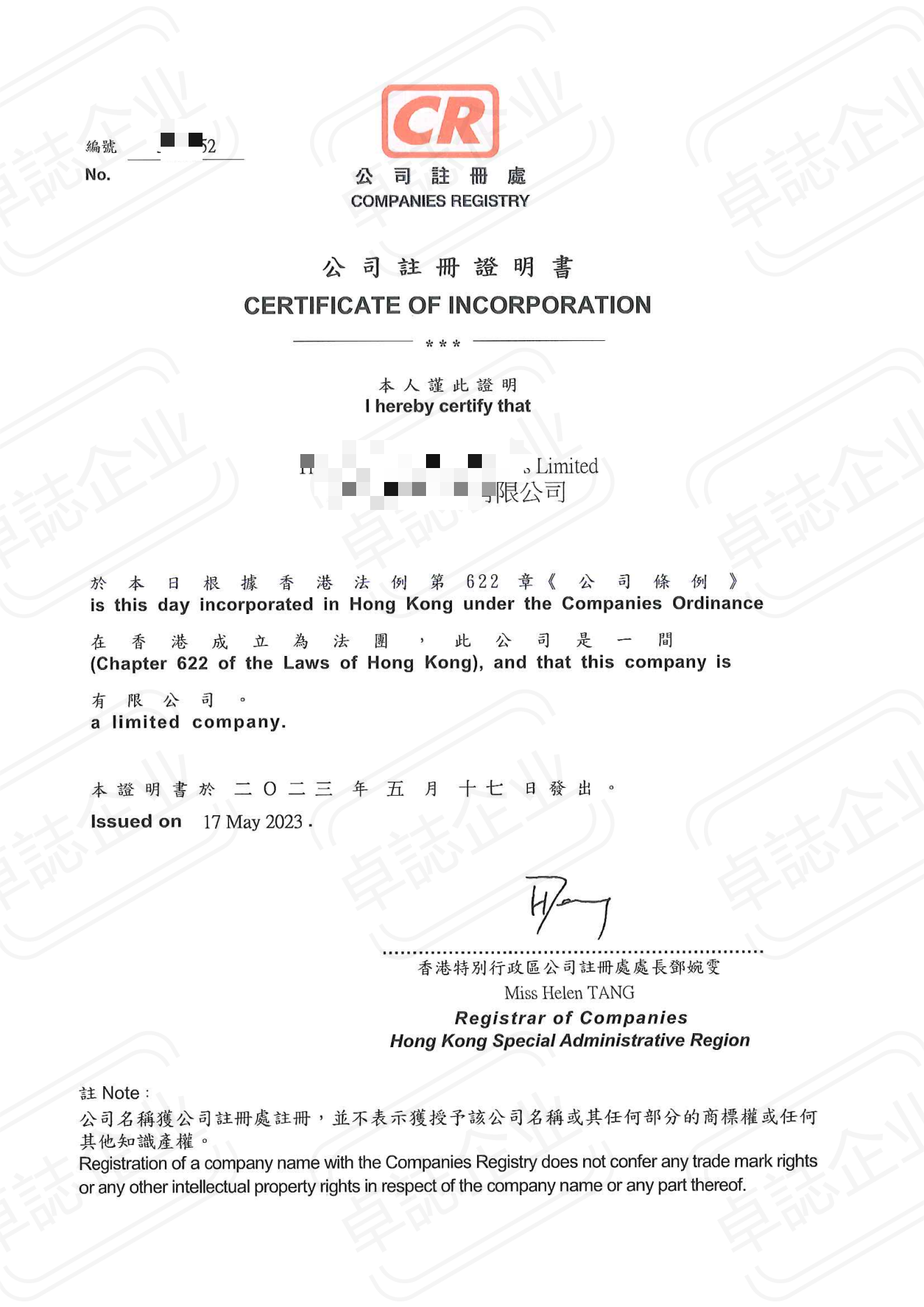香港公司注冊(cè)完成以后的文件: