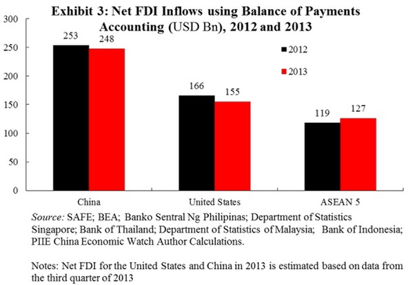 雖然SAFE數(shù)據(jù)更不頻繁,也更不細(xì)致,但它與其他國(guó)家更具可比性。因?yàn)椋琒AFE數(shù)據(jù)是基于國(guó)際標(biāo)準(zhǔn)來(lái)計(jì)算貿(mào)易支付差額的。根據(jù)SAFE的數(shù)據(jù),中國(guó)在2012年和2013年仍然是外國(guó)直接投資資本流入的首選國(guó)家。以中國(guó)資本流入的速度來(lái)看,中國(guó)仍正在FDI的存量上逐漸靠近歐盟和美國(guó)。要想趕上中國(guó)而成為FDI增長(zhǎng)的首要目的地,東盟五國(guó)仍然還有很長(zhǎng)的路要走。