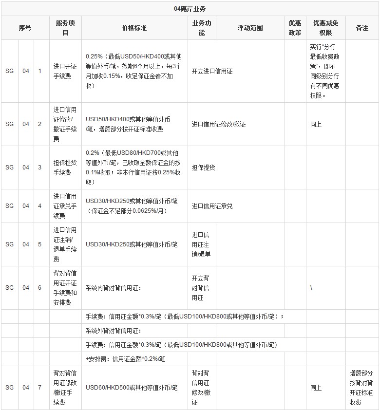 - 進(jìn)口信用證承兌:USD30/HKD250或其他等值外幣/筆(保證金不足部分0.0625%/月)