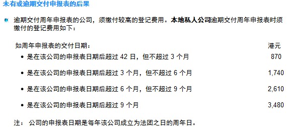 - 由成立為法團(tuán)的周年翌日起超過30天的,罰款300港元。