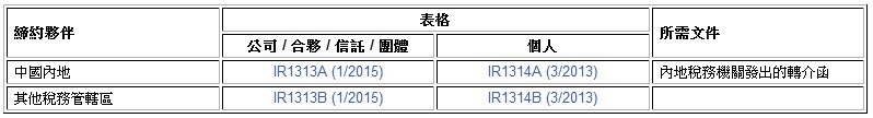 - IR1313A (1/2015) – 涉及與中國內(nèi)地簽訂的全面性避免雙重課稅安排